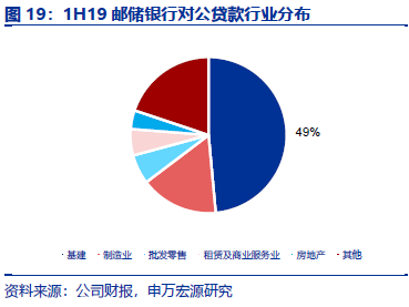 邮储银行零售贷款占比高于国有五家国有行。邮储银行成立于2007年,是最年轻的大型商业银行,拥有干净的资产负债表和稳健的资产质量。除了在2009-10年大规模经济刺激期间仍然保持审慎经营外,邮储银行通过执行专注于大型企业和零售业务的“杠铃式”的信贷策略有效地管理了风险。邮储银行零售贷款占比(>50%)较五家国有行(<40%)更高。截至2Q19,邮储银行零售贷款占比达到54.2%,而工商银行、建设银行、农业银行、中国银行、交通银行零售贷款占比分别仅为37.1%、42.8%、39.4%、37.9%、32.2%。此外,2Q19个人经营贷款和小额贷款在零售贷款中占比达到23%,而个人住房贷款占比达到61%,低于国有五家国有行。我们认为较高的零售贷款占比和小额零售贷款有助于邮储银行分散风险。公司贷款方面,邮储银行专注于高质量的大型企业,并审慎管理中型企业的贷款投放。从行业角度来看,邮储银行是中国基建最大的支持者。截至2Q19, 邮储银行与基建项目相关的贷款占总公司贷款比重达到49%。中国铁路是邮储银行最大的单一借款人,总额达到1768亿元,占公司贷款比重达到10.5%。因此,邮储银行公司贷款不良率仅为0.70%,相比工商银行(2.23%)、建设银行(2.50%)、农业银行(2.13%)、中国银行(2.52%)、建设银行(1.63%)较低。