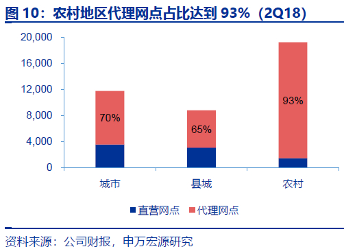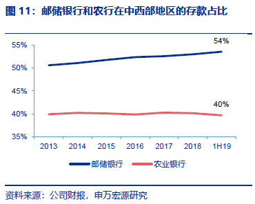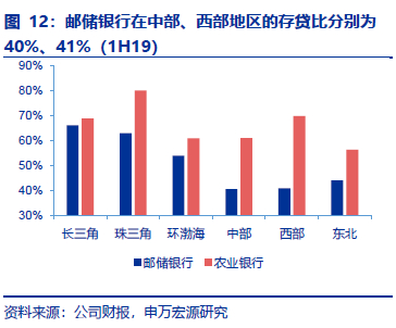 邮储银行是商业银行中网点覆盖范围最广、零售客户数量最多的银行。因此,我们可以预见邮储银行将成为行业领先的小微金融服务商。首先,邮储银行是商业银行中网点覆盖最广、零售客户数量最多的银行。截至2Q19,邮储银行网点数量为3.97万个,零售客户数近6亿人,约占中国人口数量的40%,而网点布局和客户数量是服务县城和农村地区的基础。第二,邮储银行拥有最大的分销网络,主要分布在县城农村地区。邮储银行的经营模式独树一帜,既有直营网点,又有邮政集团旗下的邮局网点。因此,其分销网络是中国银行业中最大且地域覆盖最广的。第三,中西部地区提供了超过50%的存款,为邮储银行带来充足稳定的负债。与同样在县城和农村有较多分销网点的农行相比,邮储银行存款在中西部地区占比更高,且该地区存贷比在40%左右,明显低于农行。充足的存款为邮储银行增加信贷杠杆创造了较大空间。最后,邮储银行与邮政集团之间的合作关系确保了其相较于村镇银行享有更高的声誉。在县城和农村地区,大多数百姓更信任邮政集团,同时,代理机构的员工不仅仅为当地居民提供金融服务,还深入当地人生活的方方面面。因此,我们认为只要严格把控风险,邮储银行小额辅贷业务将迎来快速增长。