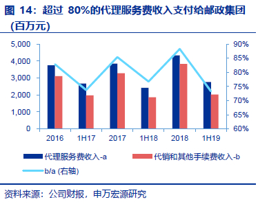 我们认为邮储银行正在重塑其与邮政集团的合作关系,在给代理网点赋能以更多资产端业务为银行以及集团员工带来直接的收入与佣金后,代理费率及支付给集团的代理费比例有商讨的空间。