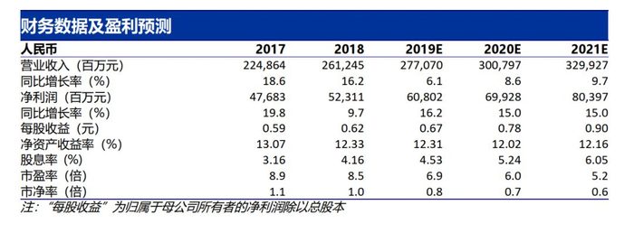 给予买入评级。由于其独特的经营模式、广泛的分销网络和庞大的客户基础,我们对邮储银行的成长前景持乐观态度,并且在未来三年中,其中间业务收入、贷存比、净息差和成本收入比均有所改善。我们认为邮储银行与集团的关系重塑将成为其业绩增长的核心驱动力。2019年以来,邮储银行已经通过在集团邮局引入小额贷款产品来推动其合作机制的改革,邮储银行赚取直接收入而集团可以获得佣金,从而为银行与集团在综合费率上的谈判争取更大的议价空间。