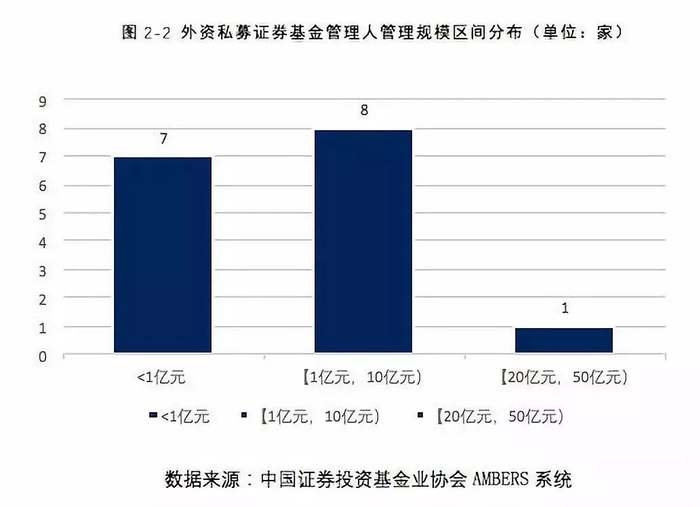 从各家机构的管理规模区间分布看,大部分外资私募证券基金管理人的管理规模尚分布在【1亿元,10亿)、以及1亿元以下两个区间内。其中,有1家外资私募证券基金管理人的管理规模在【20亿元,50亿元),有7家外资私募证券基金管理人的管理规模在1亿元以下,有8家外资私募证券基金管理人的管理规模在【1亿元,10亿元)。