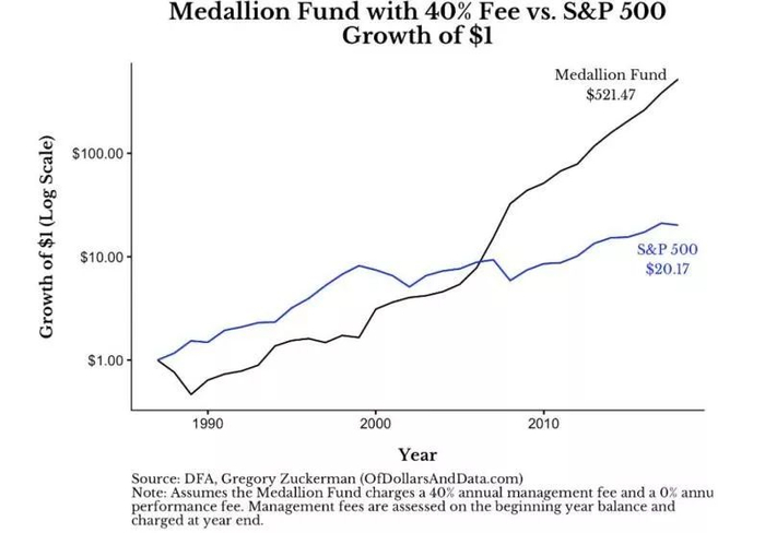 更形象一点:就是在1988年,投资1美元到Medallion Fund,到2018年将得到20000美元(扣除费用);如果在1988年,投资1美元投资标普500指数,同时期的收益之后20美元;如果在1988年,投资了1美元到巴菲特的伯克希尔哈撒韦,30年后将得到100美元。