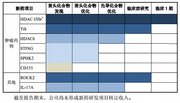 成都先导称,报告期内尚无新药研发项目转让收入,内部在研新药项目20余项,其中:已有1项进入临床Ⅰ期、2项处于临床前候选药物阶段、2项处于先导化合物优化阶段。