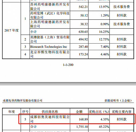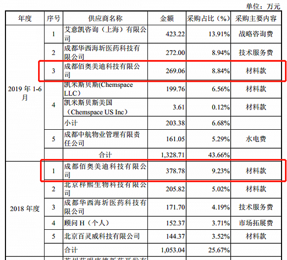据悉,在成都先导2017年、2018年、2019年上半年的前五生产经营活动相关供应商名单中,均有佰奥美迪的身影,分别位列第五、第一、第三大供应商,采购金额分别为168.89万元、378.78万元、269.06万元,采购占比分别为4.35%、9.23%、8.84%,采购内容均为材料款。