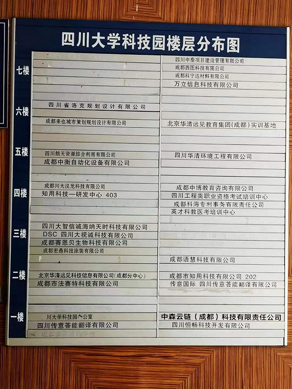 更蹊跷的是,界面新闻记者循着天眼查里记录的佰奥美迪公司地址来到现场,发现此处为四川大学科技园大楼,但在一楼的分布图上并没有看到佰奥美迪的影子。记者将该楼一至四楼全部走了一遍,并且问了三层的其他公司员工以及一楼门口的管理员,均不知道此处有佰奥美迪这家公司。