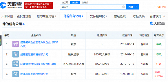 记者通过天眼查的大数据查“蒲丰年”了解到,与蒲丰年有关的公司有4家,其中只有2家存续,分别为成都成蹊企业管理合伙企业(有限合伙)和成都迈仕通商贸有限公司,蒲丰年分别持有这两家公司的50%和10%的股权。