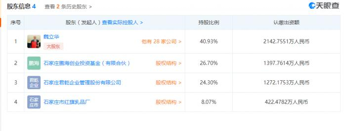 公司最新股权资料显示,君乐宝目前最大股东为魏立华,持股40.93%。新增投资机构为石家庄鹏海创业投资基金(有限合伙)和石家庄君乾企业管理股份有限公司,分别持股26.70%和24.30%,是其第二和第三大股东。