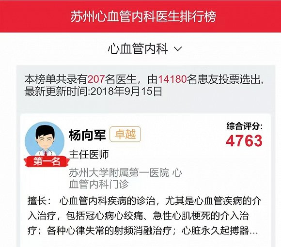 在一份14180名患者对苏州207位心血管内科医生的投票中,杨向军排名第一。