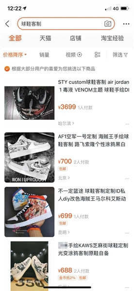 新京报记者登录淘宝平台发现,约有近百家工作室进行着改鞋生意。这些球鞋客制价格并不便宜,大部分的涂鸦价格在数百到数千元之间,而换皮的球鞋价格更是达到数万元。