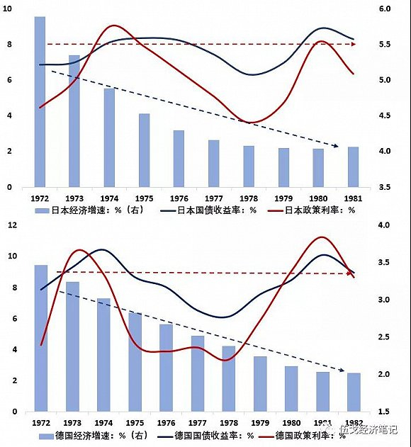 在一国潜在经济增速下行的过程中,掣肘利率下降的因素可能是多方面的。其中,较为重要的因素是成本冲击的发生。例如,日本和德国在其经济减速的过程中,“不幸”遭遇到油价等成本冲击引发的结构性通胀,其间利率中枢不但不降反而大都阶段性抬升。而直到“滞胀”矛盾消退之后,利率与经济增速才有望重回同步趋势。