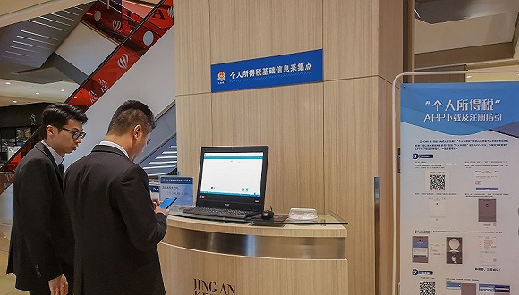 2019年1月3日,上海,市民在静安嘉里中心的个税采集点内办理信息采集和扫码下载“个人所得税”APP。图片来源:视觉中国