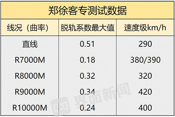 影响列车安全的因素非常多,最重要的是防止列车脱轨。2016年复兴号的试验数据显示,当轨道曲率半径为9000米、列车速度为420km/h时,脱轨系数为0.34;而当轨道为直线、列车速度为290km/h时,脱轨系数反而增大为0.51。(注:脱轨系数越大越容易脱轨,中国高铁标准为≤0.8;下文中的试验数据均指2016年复兴号的试验数据)