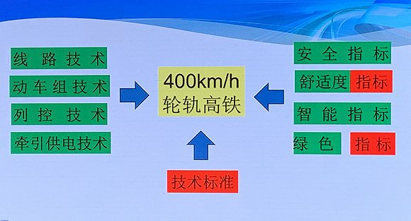 上图中绿色部分代表已实现,红色代表未实现。影响400km/h高铁实际落地的因素中,技术部分已经可以实现,但在舒适度和绿色指标方面仍有部分未达到要求,最重要的是现在还没有相应的技术标准。