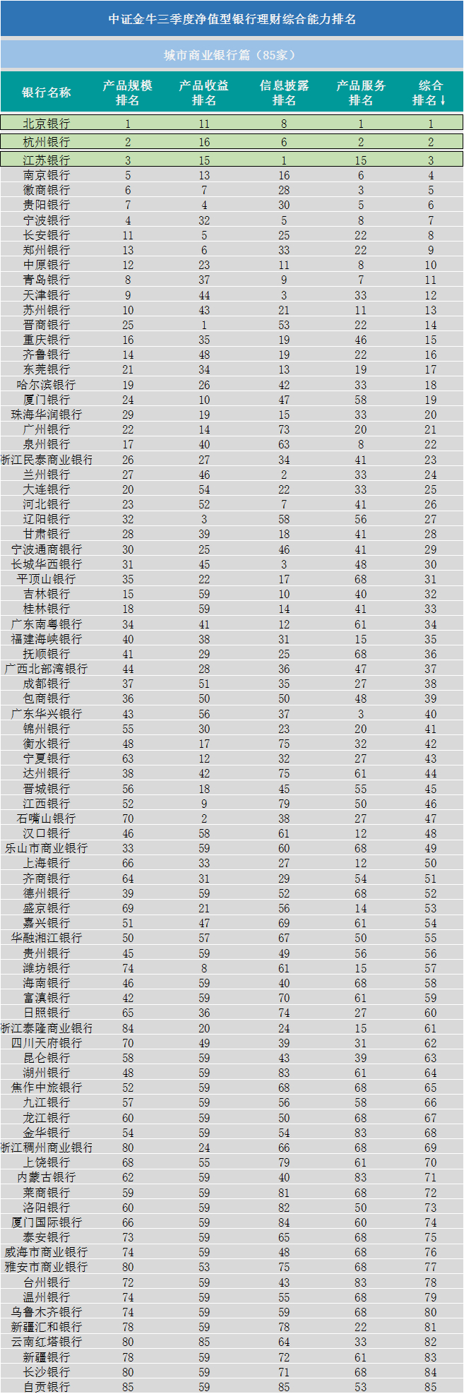三季度城商行排名中,北京银行上升至第一,杭州银行保持第二位,江苏银行升至第三。三季度排名前十的城商行还有南京银行、徽商银行、贵阳银行、宁波银行、长安银行、郑州银行、中原银行等。