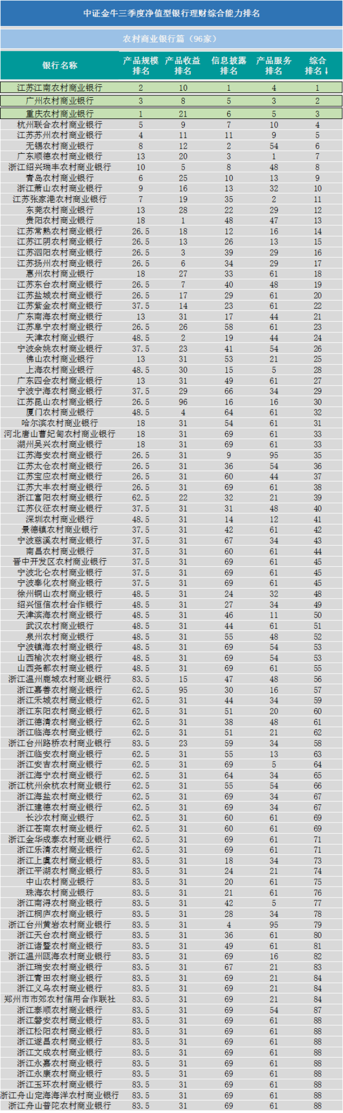 三季度农商行排名中,江苏江南农村商业银行、广州农村商业银行名次均上升一位,分列第一、第二;重庆农村商业银行排名上升五位至第三。排名前十的农商行还有杭州联合农村商业银行、苏州农村商业银行、无锡农村商业银行、广东顺德农村商业银行、绍兴瑞丰农村商业银行、青岛农村商业银行、浙江萧山农村商业银行等。