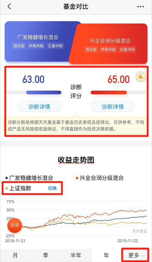 评分是需要登录账号才会显示的;走势图中的对比指标是可以切换的,内容跟电脑端一致(建议:增加一个“全债指数”的对比指标,有债券型基金对比的时候还是用的到的);右下角更多按钮中有更长的时间段选择。(这里有个BUG希望天天基金的开发早日修复:“2年”的走势画面展示的是月度的,大家在用的时候需要留意)。
