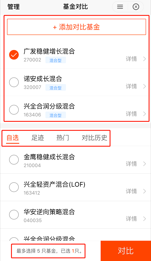 选好了基金之后,点“对比”按钮,进入到对比的详情页面。