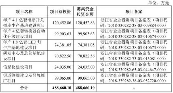 其中,12.05亿元用于年产4.1亿套墙壁开关插座生产基地建设项目,9.99亿元用于年产4亿套转换器自动化升级建设项目,7.44亿元用于年产1.8亿套LED灯生产基地建设项目,7.08亿元用于研发中心及总部基地建设项目,2.40亿元用于信息化建设项目,9.91亿元用于渠道终端建设及品牌推广项目。