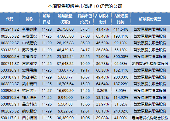 经历上周的解禁峰值后,本周解禁规模大幅回落。根据wind数据统计显示,11月25日至29日,将有33家公司合计35.54亿股限售股解禁。以11月22日收盘价计算(下同),约合总市值338.40亿元。