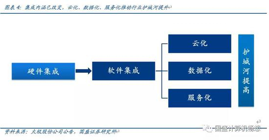 集成内涵已改变,云化、数据化、服务化推动行业护城河提升以及行业集中度提高。传统系统集成商仅为硬件集成,随着云计算、大数据及客户需求深化,软件产品和服务向基于云计算方向发展,软件产品和软件服务相互渗透,向一体化软件平台的新体系演变;产业模式则从传统“以产品为中心”向“以服务为中心”转变。服务化及软件能力成为竞争关键,集成行业护城河有望不断提升,行业集中度也将进一步提高。