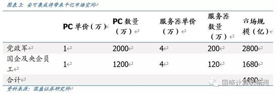 安可集成将带来千亿市场空间。1)根据倪光南院士的演讲资料(《倪光南:从中美贸易摩擦看科技自主创新的机遇与挑战》,2018年8月),全国的党政机关,各个部门人员用的电脑共有2000万,未来还将逐步渗透到国资委下的企业。根据统计局数据,2015年全国党政机关公务员超过 700 余万人,事业单位编制人员3100 余万人、中央企业员工1200余万人,总数合计约5000万人。我们假设单台电脑1万元的集成价格测算,仅党政机关国产终端将释放2000亿的安可集成市场空间。2)在国家政务、智慧城市和重要行业的云化趋势下,假设单台服务器均价4万的集成价格,PC:服务器=10:1的比例测算,服务器安可集成与云计算集成服务所释放的市场空间也将超过千亿。