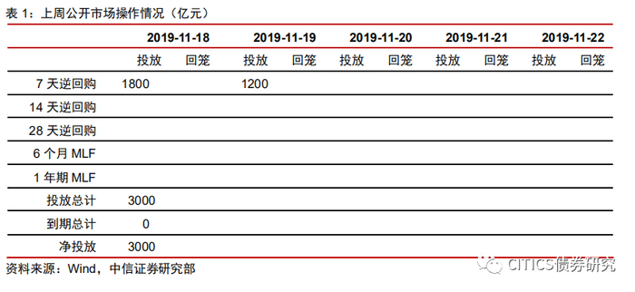 上周(11月18日~11月22日)开展3000亿元逆回购操作,500亿元国库定存,无资金自然回笼,实现流动性净投放3000亿元。本周(11月25日~11月29日)预计自然回笼资金3600亿元。