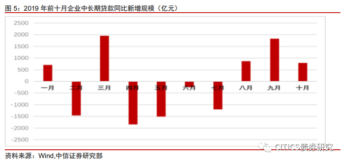 首先,我们将2019年前十个月企业中长期贷款与2018年前十个月企业中长期贷款新增量作差,如图5所示,可以发现2、4、5、6、7这五个月2019年的企业中长期贷款新增量远少于2018年规模。2019年前十个月企业中长期贷款累计值为50,616亿元, 而2018年这一数值为50729亿元, 比较看来2019年企业中长期贷款累计值减少了113亿元。总体而言,企业贷款需求疲软,但从八月份以来企业中长期贷款出现持续增加态势。
