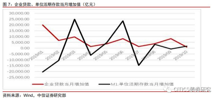 自2017年以来,M1增速出现大幅回落,2018年2月M1同比增长率跌至8.5%,M1-M2剪刀差由正转负。进入2019年以来,M1-M2剪刀差有扩大趋势,2019年10月M1同比增长率跌至3.3%,说明2019年企业现金持有意愿持续低迷。M1的构成部分中主要为企业活期存款与机关单位活期存款,其中地方政府融资平台贷款也在其中。M1增速低于M2,说明需求疲软,实体经济中有利可图的投资机会在减少,钱不愿意进入实体循环中,堆积在金融体系内,货币构成中流动性较强部分转变为较弱部分,继而影响实体企业投资和经济增长。M1增速过低也反映当前居民、企业资金趋近状况。从图7可以看出,8月以来企业贷款呈现持续增长态势,单位活期存款当月增量低于企业贷款当月增量,或反映构成企业贷款增长主要因素的企业新增中长期贷款重点在于企业内部债务腾挪。