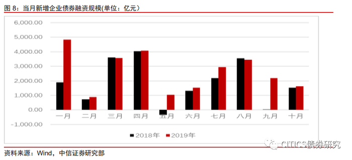 截至11月15日,四季度专项债发行仍主要为再融资债券。我们通过对比2019年前十个月企业债券发行量与2018年同时期企业债券发行量,发现企业通过发债进行融资的规模显著增长,企业债券成为代替非标融资的重要手段。从图七可以看出,2019年在前十个月中有七个月发债规模超过2018年发债规模,且一月与九月发债规模显著高于2018年。2019年前十个月企业债券融资总额与2018年相比增长了7584亿元。