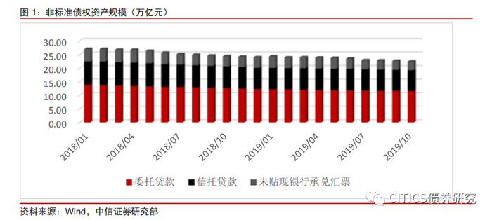 从央行社融统计口径来看,在2018年2月非标资产达到27.07万亿元的顶峰后,从3月开始下滑,截至2019年10月最新社融数据统计,非标规模下滑至22.47万亿元,相较2018年2月减少4.6万亿元,其中委托贷款减少2.15万亿元,信托贷款减少1.03万亿元,未贴现银行承兑汇票减少1.42万亿元,相较2018年年末数据,三类非标资产规模减少1.55万亿元。