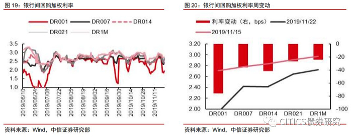 货币市场:银行间质押回购加权利率全面下行。11月22日,DR001加权平均利率为1.95%,较上周变动-76.20bps;DR007加权平均利率为2.42%,较上周变动-36.17bps;DR014加权平均利率为2.41%,较上周变动-41.96bps;DR021加权平均利率为2.65%,较前一周变动-26.80bps;DR1M加权平均利率为2.73%,较前一周变动-24.52bps。截至11月22日,SHIBOR方面,隔夜、7天、1个月、3个月分别变动-74.50bps、-20.10ps、0.45bps、1.70bps至1.95%、2.54%、2.79%、3.04%。