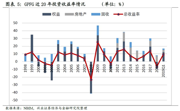 由于GPFG全部投资于海外,NBIM在衡量投资组合收益率时采用一揽子货币的口径来排除不同货币带来的汇率影响,例如2018年采用35种货币组成的货币指数来计算投资收益率。截止2019年3月31日,在NBIM 20年的投资管理下,GPFG的年化收益率约为5.84%,扣除管理费用和通胀影响后的实际年化收益率约3.91%;过去10年的年化收益率9.81%,扣除管理费用和通胀影响后的实际年化收益率约7.88%。按资产类别来看,由于权益类资产占比较高,其收益率对总组合的投资结果影响较大,2011年起加入房地产投资后抵消了部分权益资产的波动。