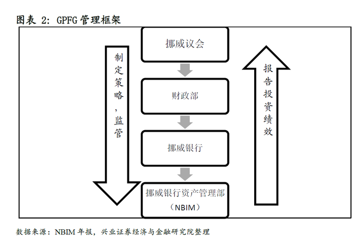 财政部为受托机构,NBIM为执行机构。GPFG在成立初期由挪威财政部直接负责管理,主要投资于政府担保债券等低风险固定收益类产品,风格非常保守。1998年,挪威议会批准成立NBIM(Norges Bank Investment Management),财政部作为受托机构制定投资决策,将GPFG资产配置比例调整为60%的股权和40%的债权,NBIM作为执行机构,根据财政部的投资策略执行基金管理的具体业务,至此GPFG的管理框架初具雏形。