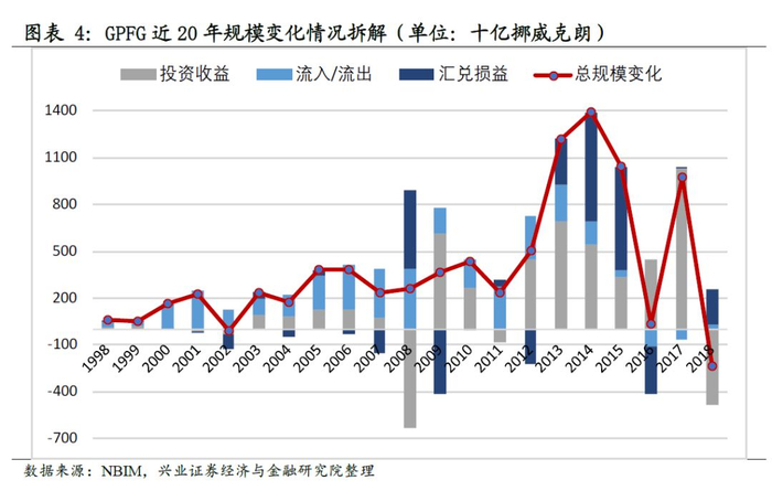 截止2019年3月末,GPFG总资产市值8.94万亿挪威克朗,约1.04万亿美元,是世界上最大的主权财富基金。自1998年NBIM成立并正式管理,GPFG已产生4.4万亿克朗投资收益,超过挪威政府的财政转移拨款3.38万亿克朗。根据数据显示,GPFG的规模变化来自于三个方面:1)投资损益。98年至今投资收益为负的情况出现过5次,其中2008年金融危机期间,基金亏损超6000亿克朗,2018年亏损4850亿克朗,是20年中亏损最严重的两次。2)财政拨款或支取。GPFG可用于财政开支,但比例不得超过规模的4%(短期可能存在弹性),但除了2016和2017年以外,挪威政府的财政拨款持续对GPFG带来资金注入,是基金的规模快速上升的主要来源。3)汇兑损益。GPFG全部投资于海外,目前共投资了73个国家9158家公司,涉及数十种货币,因此汇率变化对基金的规模也产生了较大影响,例如2018年挪威克朗的走弱为GPFG带来了2240亿克朗的正贡献。