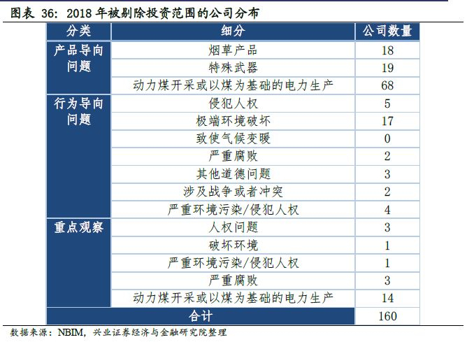从2008年以来,NBIM陆续发布十多份责任投资报告,主要关注环境问题中的水治理、海洋污染、气候变化和社会问题中的人权、儿童权利、纳税透明度、反腐败七大领域。2018年,NBIM调查所投资公司的社会责任风险,被调查的公司市值占GPFG权益资产市值的62%,共有160家公司从GPFG的投资范围中剔除。