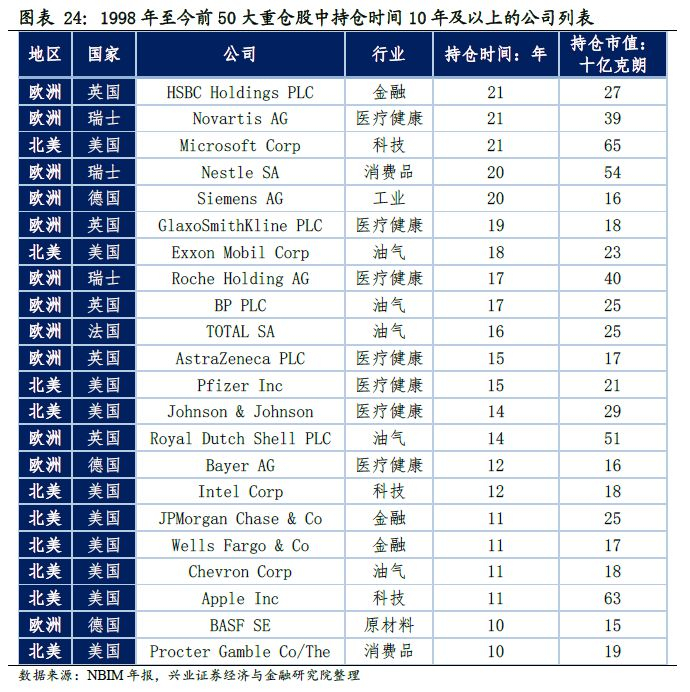 我们选取持仓市值排名前50的重仓股来对NBIM的投资行为更深入的研究。2018年GPFG组合覆盖了73个国家及地区总共约9200家公司,前50大重仓股合计规模占全部持仓比重接近25%,具有一定集中度。我们发现重仓股具有四大特征:1)持仓时间平均9年以上,40%以上公司持有超10年;2)超过半数重仓个股来自于美国公司,行业配置上偏好科技板块;3)偏好超大市值股票,近80%的持仓企业超千亿美元;4)80%的持仓公司的市盈率低于30倍,业绩估值匹配较合理