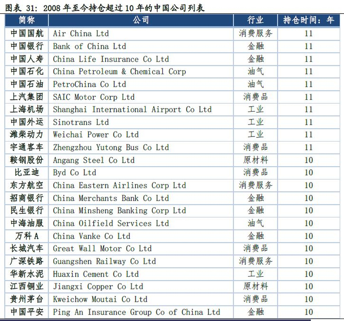 由于持仓数据并未有A股和H股之别,导致部分A/H公司无法区分,故以下所涉及的公司均为A股或A/H股。我们统计发现2008年至今,NBIM总共对1560家中国企业进行过投资,其中有26家公司持仓时间超过10年,这26家公司基本都属于现下外资偏好的“核心资产”系列。