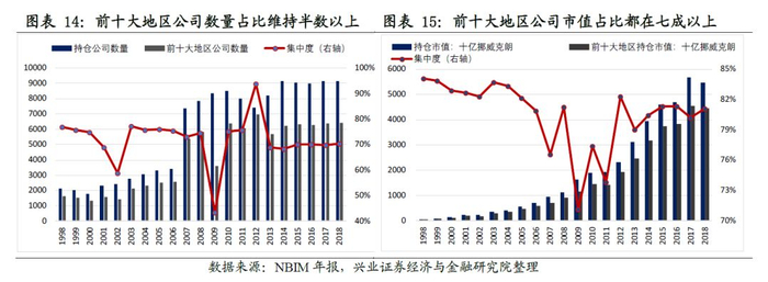 截止2018年12月,GPFG的资产覆盖全球73个国家和9158家公司,主要集中在北美、欧洲,占比高达74.1%。对于亚洲和大洋洲资产配置占比为19.3%;对于新兴市场资产配置占比为10.3%。从具体国家及地区来看,尽管GPFG投资的地域范围非常广泛,但持仓规模前十的地区(见下图)占到总规模的80%以上,70%以上的公司都处于这10大地区,集中度非常高。值得注意的是,自2003年NBIM首次配置中国大陆市场起,中国大陆区的持仓出现快速上升,目前规模排名第七,企业数量排名第三,也是新兴市场中唯一双双进入前十的地区,后续NBIM或将继续扩大对中国内地市场的投资。