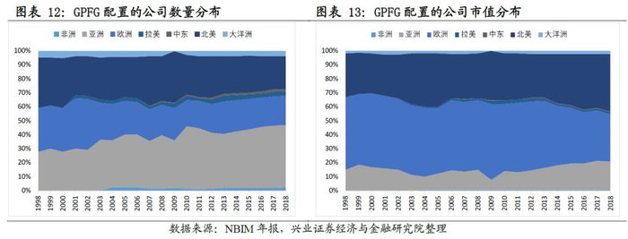 具体来看权益资产配置情况,我们整理了1998年至2018年这20年间GPFG的持仓,随着基金规模的扩大,权益资产规模扩大了近80倍,投资范围从1998年的26个国家及地区扩散至目前的78个,投资的公司数量也从1998年的2100家上升至目前将的近9200家。NBIM更偏好亚洲、北美和欧洲三大区域的企业,但对北美和欧洲的投资比较集中,亚洲地区的投资更为分散。2012年前后,NBIM开始进军非洲和中东市场,目前对非洲地区的配置主要集中在埃及和南非,中东地区主要集中在以色列。
