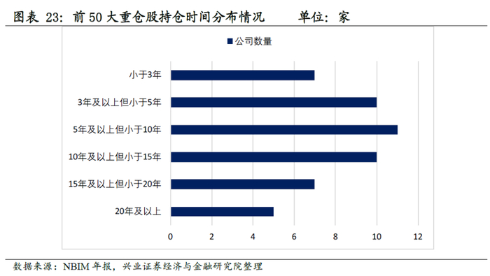 NBIM对于流动性要求较低,因此可以长期持有股票。截止2018年12月,NBIM重仓股(持仓前50)平均持有时间为9.3年,持有时间长于10年的股票共有22支,持仓占比为44%,其中汇丰控股、诺华制药以及微软集团持有时间超过21年,意味着从NBIM成立开始至今对这三家企业的持仓规模从未跌出过前50名。中国有两家公司进入前50名,分别为腾讯控股和阿里巴巴集团,持有时间低于4年。