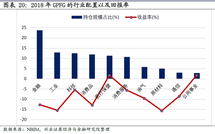 从行业分布的角度看GPFG的权益资产配置情况,NBIM更偏好金融板块。截止2018年12月,其十大股权投资行业(按持仓比重由高到低)分别为:金融(23.7%),工业(12.9%)、科技(12.6%)、消费品(11.9%)、医疗保健(11.4%)、服务(10.8%)、油气(5.9%)、材料(5%)、通信(3%)、公用事业(2.8%)。2018年GPFG的股权投资表现不佳,基金在健康医疗和公共事业板块上取得正回报,回报率分别为1.8%、1.7%。其他八个板块中,基金在金融、工业、消费品、原材料板块的投资损失最大,回报率均超过负10%。