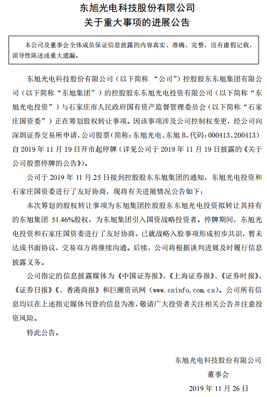 原标题:东旭光电投资和石家庄国资委已就战略入股事项形成初步共识