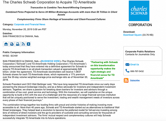 美国最大折扣券商“零佣金”后又有大动作,嘉信理财260亿美元收购德美利证券