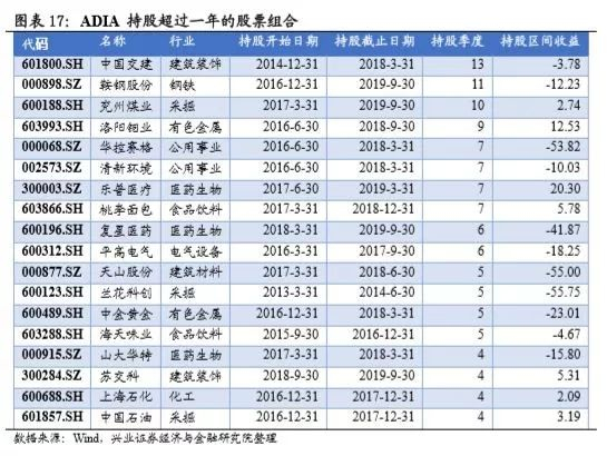 ——长期偏好周期行业,个股持股时长较短。2010年至今,ADIA共进入过115只A股的前十大流通股,这些个股涵盖各个行业,个数排名靠前的行业为医药生物、有色金属、建筑装饰、化工、采掘、机械设备等,周期行业出现的频率较高。ADIA作为主权财富基金虽然是长期投资者,但对特定股票的持股市场并并不长。ADIA投资过的115只股票中,仅18只股票持股时间超1年(含1年)。