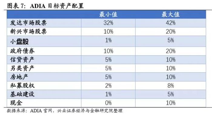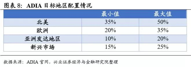 ——资产配置:大类资产配置以股票为主,股票资产最高可占整个资产组合的62%,最低占比为42%。其次占据较大比重的资产类别为政府债券,占比区间在10-20%。国别配置偏好发达地区的投资。在ADIA维持近十年不变的目标地区配置比例中,仅分配给新兴市场15-25%的目标投资比重,其余投资均位于发达地区,如北美(35-50%)、欧洲(20-30%)及亚洲的发达地区(10-20%)。