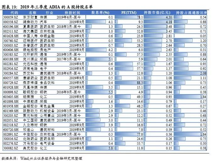 ——三季度大幅加仓。ADIA最新新增10亿美元的QFII额度于2019年6月24日获得,因此其于2019Q3对A股大幅加仓,是三季度新进入A股流通股东数量最多的QFII机构。新增持19只个股中,行业分布较为分散,符合其“拥有强大管理团队、估值合理、具有增长潜力”的选股标准,增持个股偏二三线龙头。具体名单详见正文。