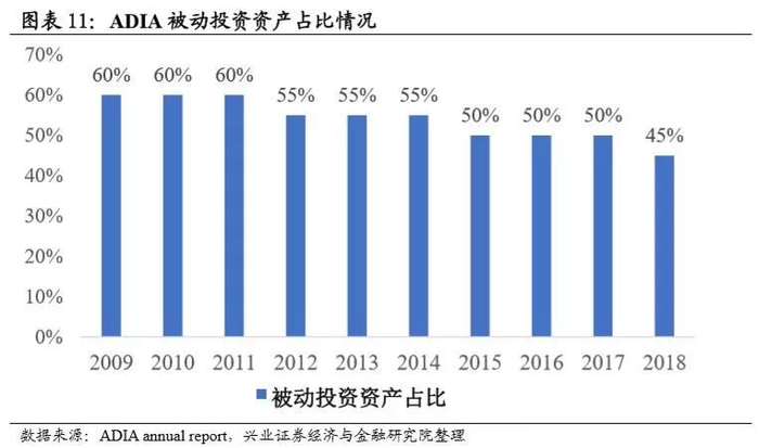 ——投资运作策略:外部基金经理和被动投资特点。55%的资产由外部基金经理运作,旨在利用外部基金经理的专业性。在筛选外部基金经理时有着严格的流程,包括网罗长名单、精选短名单、进行尽职调查、投资委员会批准等。45%的资产为被动投资,采取指数复制策略,主要在于被动投资能够及时、大规模地执行其所需的资产配置,同时将交易成本降至最低。但从历史趋势看,无论是外部投基金经理运作占比还是被动投资占比,均是呈现不断下降的趋势,ADIA的主动化趋势正在逐步增强。