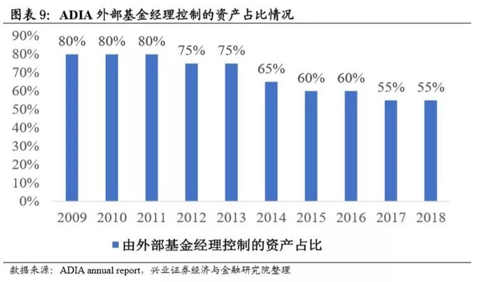 55%的资产由外部基金经理运作。凭借着对某类资产的更深入了解、对某个地区的熟悉和更多年的实战投资经验,外部基金经理或许能带给ADIA更高的收益回报。ADIA旨在利用外部基金经理的专业性,过半数的资产均交由外部基金经理管理。2009年,交由外部基金经理管理的资产高达80%,这一比例呈不断下降的趋势,于2017年达到55%的水平。