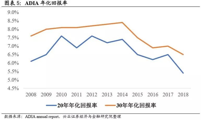 ADIA旨在为投资者提供长期价值和回报,实现其制定的长期投资目标,据其年报披露,ADIA考察20年和30年年化回报率。20年年化回报率在5%-8%的区间浮动,30年年化回报率相比20年更高,处于6%-9%的区间波动。