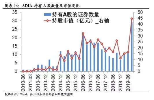 最新持股个数和市值达到历史新高。ADIA在A股市场上的投资先是经历了从2010-2016年的上升阶段。在该阶段内,无论是持股数量还是持股市值均处于上升的态势。截至2016年6月30日,ADIA的持股数量及持股市值一度到达高峰,共持有23只A股,市值高达32.08亿元。此时正是中国A股市场经历2015年年中下跌后的股市底部阶段,ADIA趁此机会大幅买进A股相关个股。2016年年中至2018年年底,ADIA持有的A股证券数量及持股市值整体处于下降的趋势。然而,今年三季度,ADIA在年中获取新的QFII额度后,大举加仓A股, ADIA在A股市场持股在前十大流通股的股票个数共29只,持股市值为44.5亿元,持股个数和持股市值均达到历史新高。